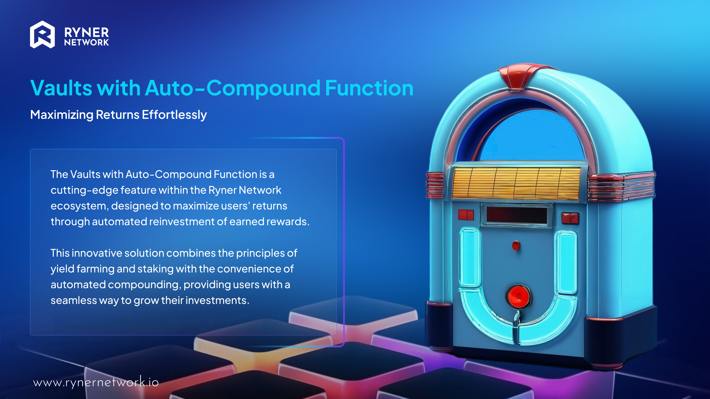 The Vaults with Auto-Compound Function is a revolutionary feature in the Ryner Network ecosystem, offering users an effortless way to maximize their returns. By combining high-yield opportunities with automated reinvestment, Ryner Network provides a powerful tool for achieving financial growth. The user-friendly interface, robust security measures, and flexible investment options make the Vaults accessible to everyone, fostering broader participation in the DeFi space. Join Ryner Network and take advantage of the Vaults with Auto-Compound Function to unlock the full potential of your investments and achieve unprecedented financial success.